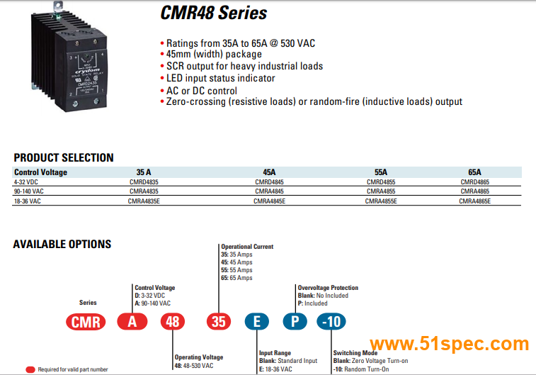 | CMRA4835-10 | 90-140 VAC | 35 A | 48-530 VAC | DIN Rail |