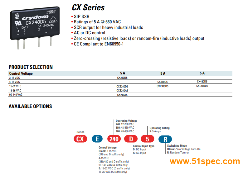 | CXE480D5 | 15-32 VDC | 5 A | 48-660 VAC | PCB |