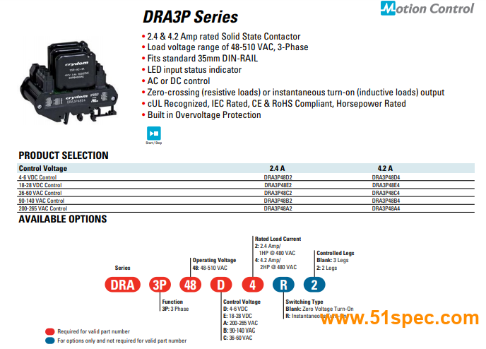 | DRA3P48A4R2 | 200-265 VAC | 4.2 A | 48-510 VAC | DIN Rail |