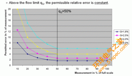 在限制值 qG 以下,允許誤差隨流量減小而增大
