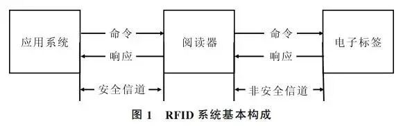 (3)應用系統:對讀寫器轉發的所有電子標簽信息進行集中統計和分析,并通過安全信道反饋給讀寫器。RFID系統基本構成如圖1所示。