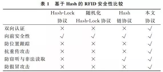 基于Hash的RFID協議安全性比較如表1所示。表中以“×”表示不符合安全,以“√”表示符合安全。